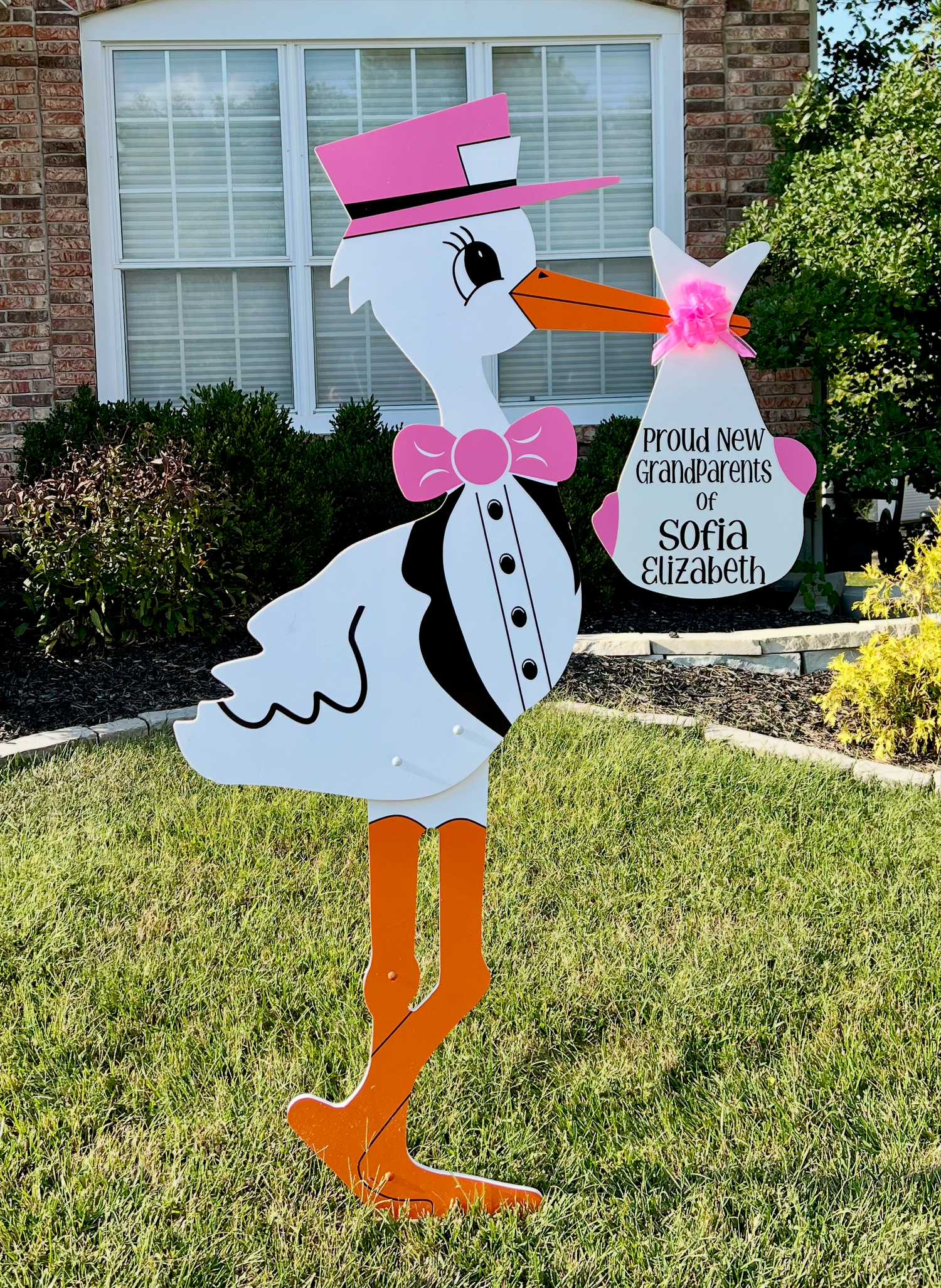 Celebrate a new baby's arrival with our 6 ft tall pink or blue stork signs. Our handcrafted yard signs are made from top-quality materials, offer a charming way to honor the newest family member. Each stork sign includes a personalized bundle with the baby's name, length, weight, and birth date, or a custom message of your choice. At the end of the rental period, the customized bundle is left behind as a keepsake for the family to enjoy.
